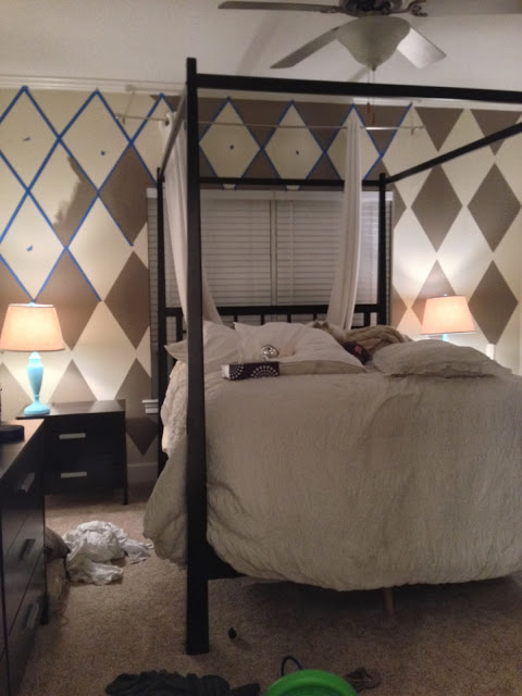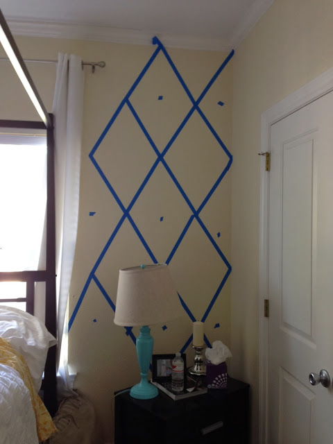 I obviously got this inspiration from pinterest…doesn’t everyone these days?! I must say I was not the most organized about it! I had several people give me tips such as using a level…did I use a level? No, would my job have been easier? Maybe! But I literally just started taping one afternoon thinking, if it looks bad I will take the tape down. Well luckily it wasn’t a huge waste of tape and it worked out for me! What I did was take a ruler and every side and the center width are all the same length. I put a piece of tape in all the areas I was not going to paint, just for precaution in case I got carried away while painting! I painted it all by hand with a brush instead of a roller to prevent any splashing or accidentally getting outside of the tape!