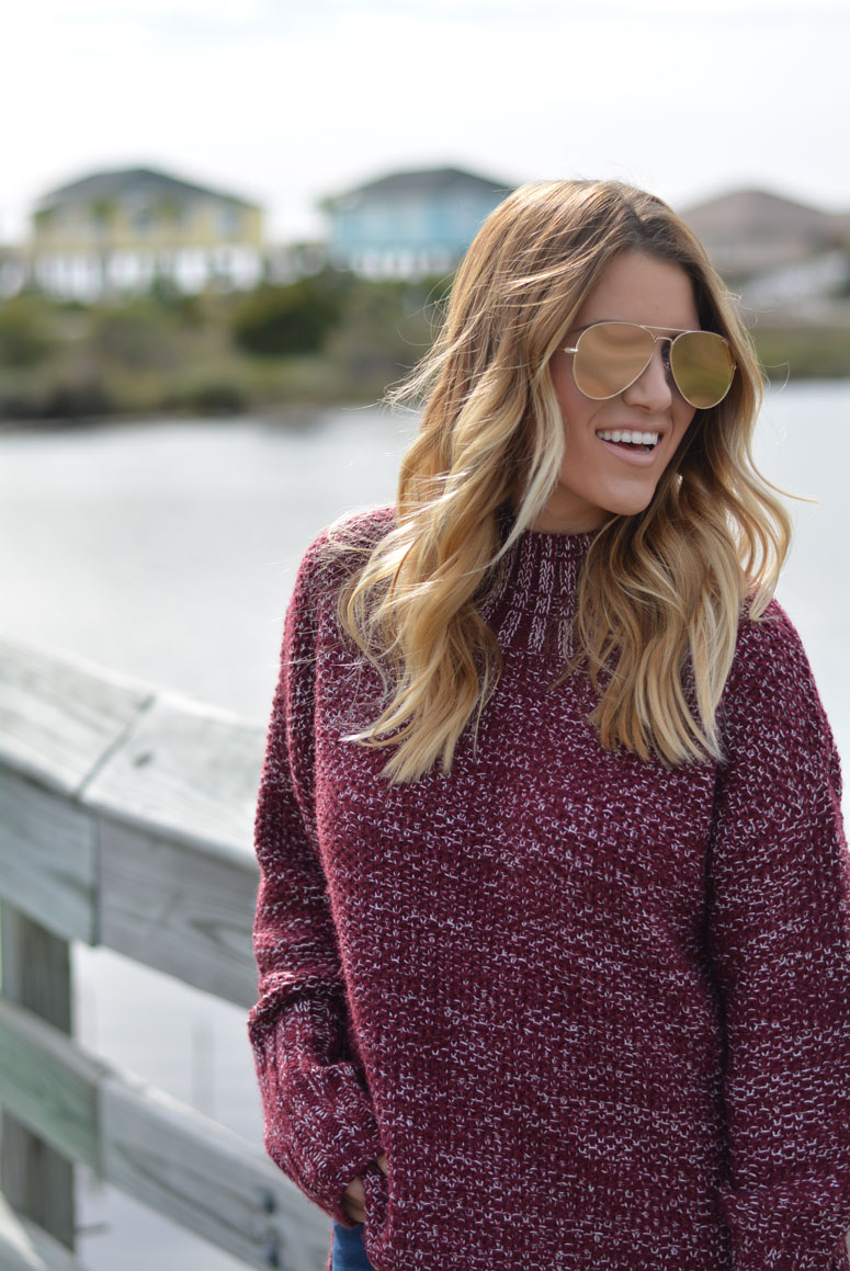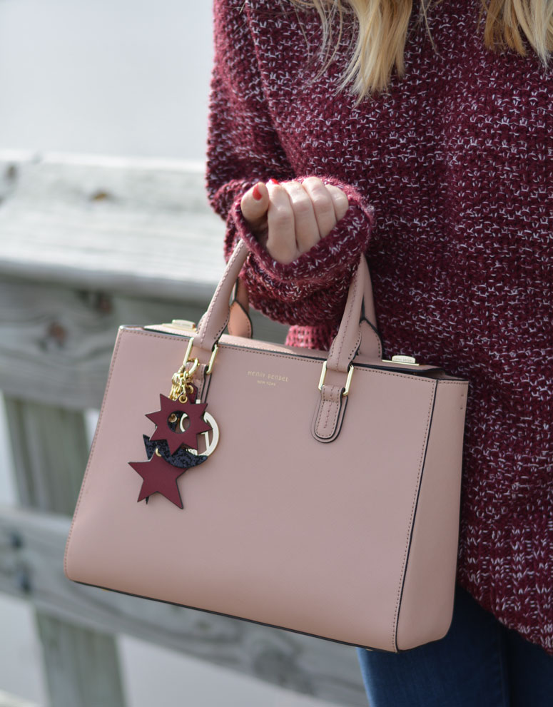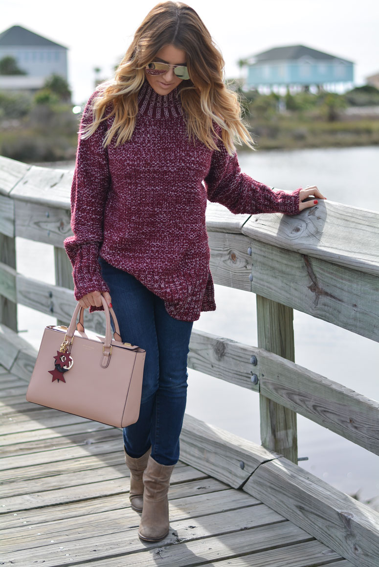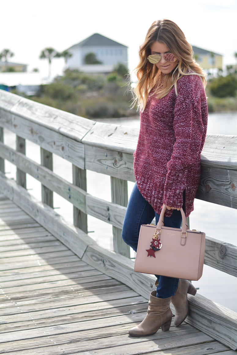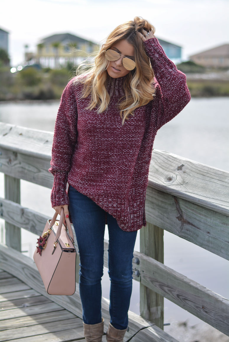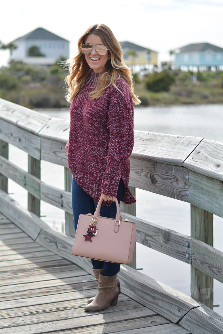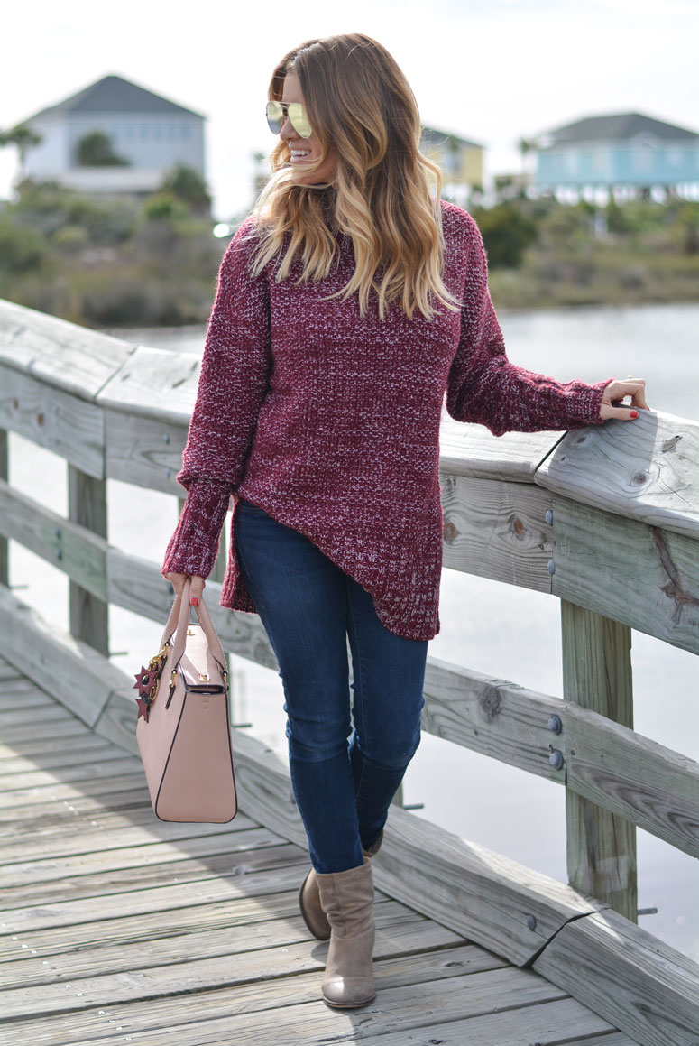 I am obsessing over this sweater. I sized up and got a medium for two reasons. One, I wanted to be able to wear it when my bump gets bigger and two, I want to be able to wear it with leggings. I love pairing wine and blush together – they are two of my favorite colors and even more so my favorite combination paired together. Btw – my bag is on MAJOR SALE! 50% off!!! Scroll to the bottom to shop before it sells out!