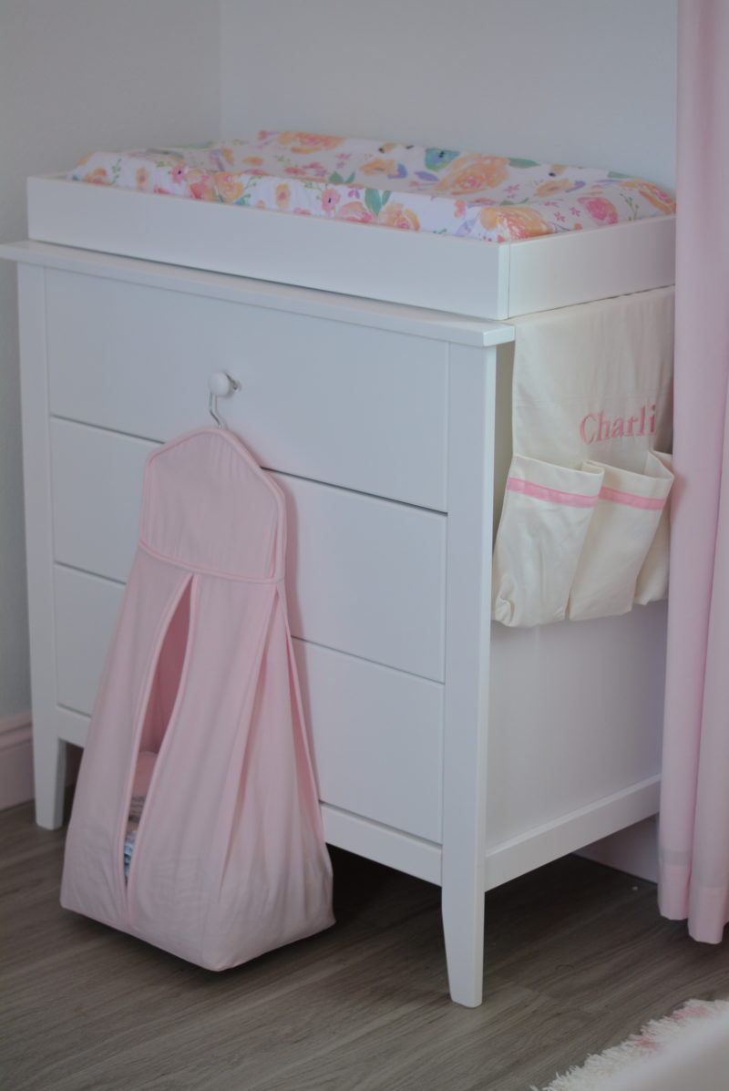 Dresser | Changing Table | Crib | Charli Scout Sign | Watercolor Painting by Jenn Thatcher | Curtains | Bed Skirt | Sheets | Changing Pad Cover | Shag Rug | Moses Basket | Pink Rug | Changing Table Organizer | Diaper Organizer | Baby Monitor |