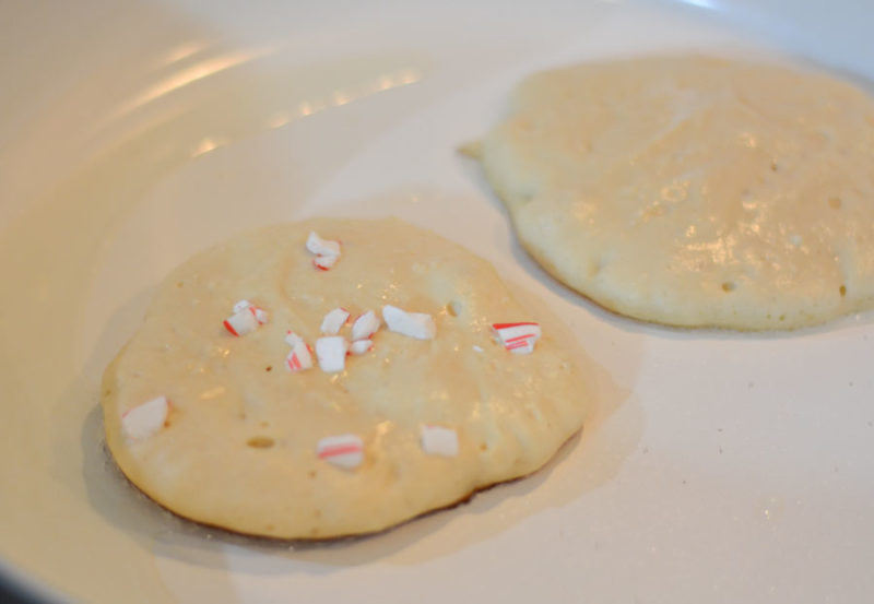 (in a plastic bag – crush one candy cane and sprinkle on top of pancakes as soon as you pour it in the pan)