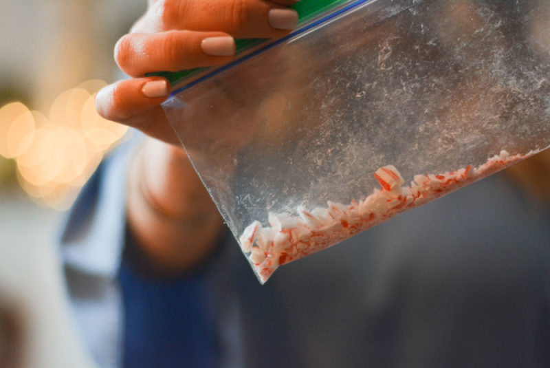 I only put the candy cane pieces on one side for two reasons. It is a strong flavor and you do not want it to be over powering as well as they melt and become sticky and can stick to the pan. Avoid this by keeping plenty of coconut oil or oil of your choosing!