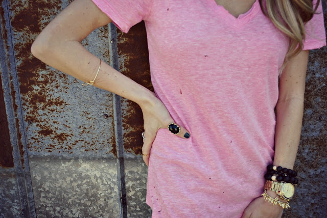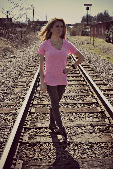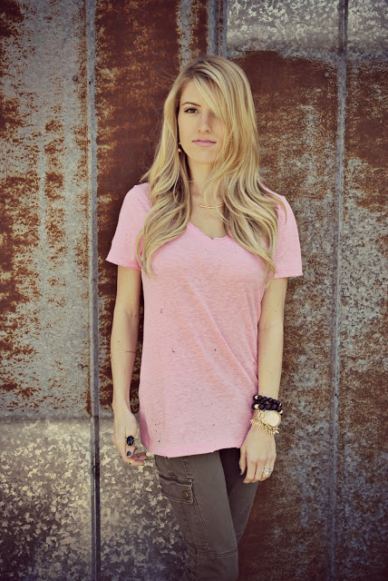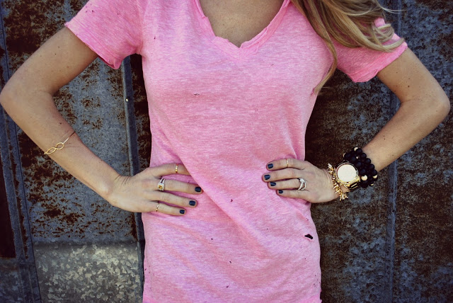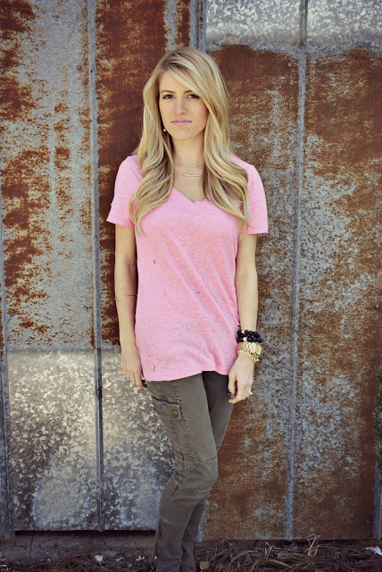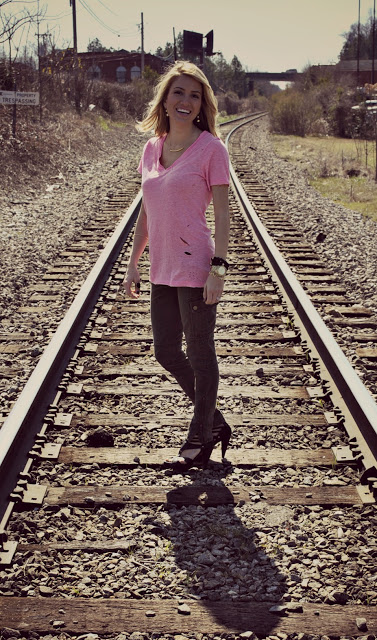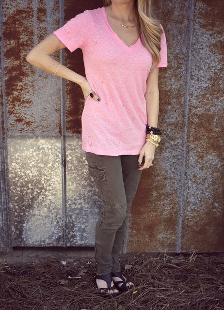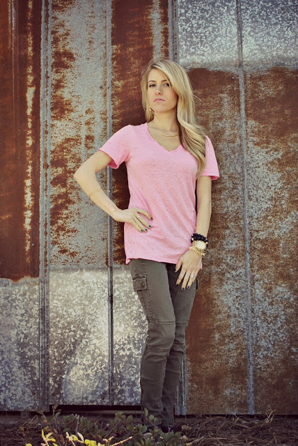 So I love a good ripped up Tee…but I can not justify paying 64$ for it. Maybe I am cheap, but I am not doing it! So I bought a 8$ old navy tee and poked holes and ripped it myself! This is what I got, I actually ripped the back up a little more and realized after I got home we didn’t get pictures of the back! I am so sorry! But you get the idea!!! I paired my casual ripped tee with some army green cargo skinnies and some strappy black chunky heels to dress it up.. I love a good dressed up casual outfit!