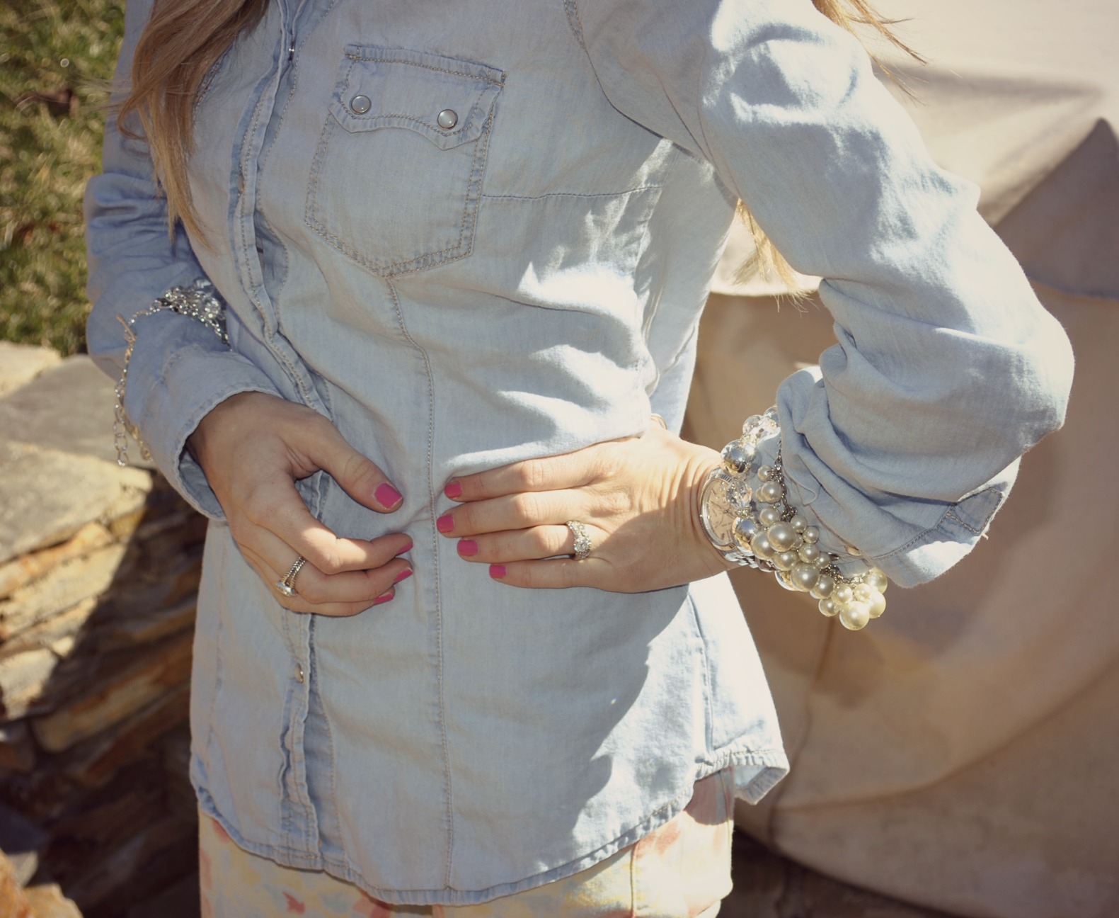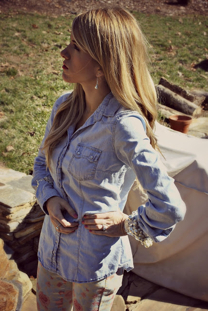 Hey y’all!!! I hope everyone had a great weekend!!! I am so ready for spring, I can’t even take it anymore!! I can not wait to live in Florida and think that 53 degrees is cold!!!! Today was beautiful and might have looked like spring was right around the corner, but it sure didn’t feel like it at 37 degrees! But the cold aside, I still decided to channel my spring fever today and dress in floral, chambray, and pearls!!! So check out these gorgeous teardrop pearl earrings from BCharmed at Gloss Jewelry!!! They are giving a pair away to one lucky LHB reader!!!