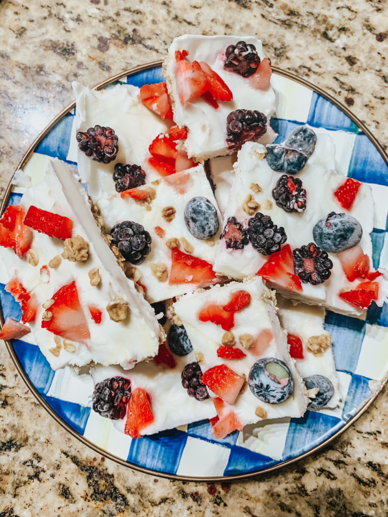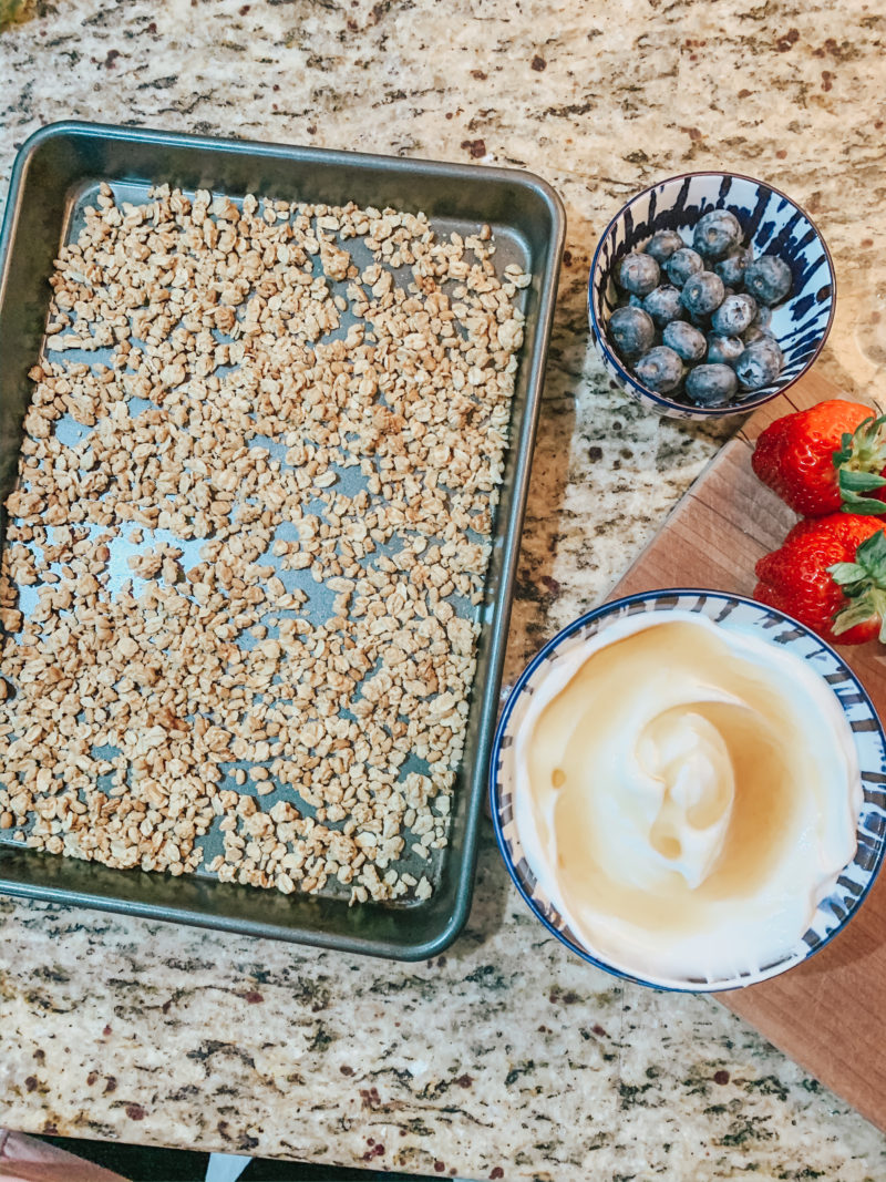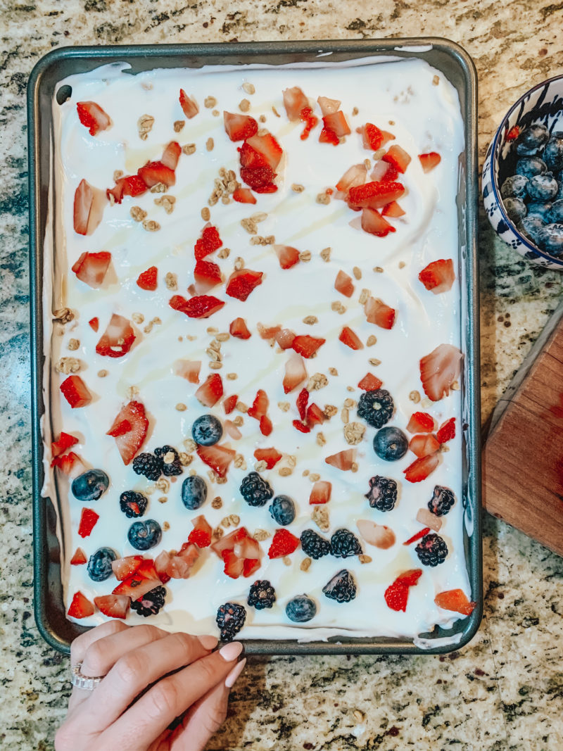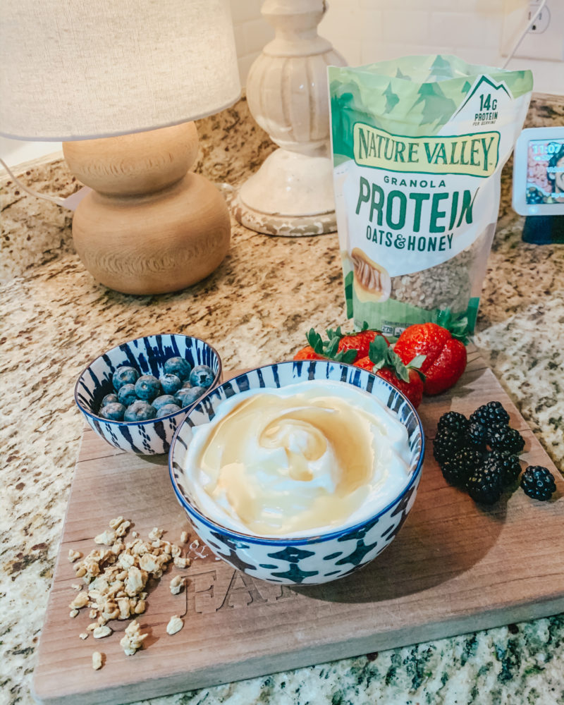 Step 3. Sprinkle your chopped fruits over top the yogurt. I add a little bit more granola (mostly for looks). I love this part because you can customize to your families likes. Charli and I love ALL the fruit and Ryan and the boys do not. So I typically do ours half and half with the blueberries and blackberries.