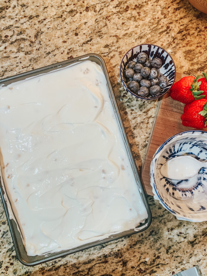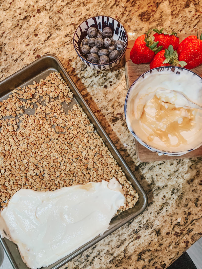 Step 1. Light cover your baking tray with granola. We put ours on the bottom because it keeps the yogurt from sticking to the pan. This almost gives it more of a crust but the yogurt does settle down and around the granola, it is just enough base to keep everything from sticking.