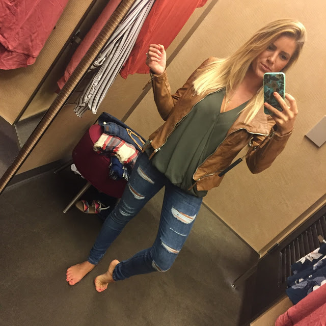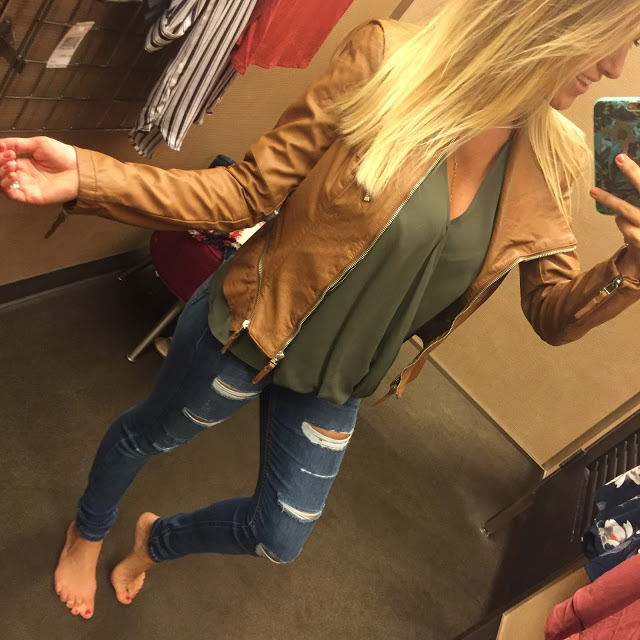 First up is a pair of the most comfortable jeans I have ever put on my body and they were so stinkin affordable! I have them on with several of the tops pictured because I didn’t want to keep changing jeans and these were that good that I never felt the need to take them off. Which is also why this entire outfit is being shipped from the store, currently! This faux leather jacket is on major sale and under $65!!