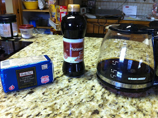 In small bowl wisk together butter, molasses, and coffee until blended completely. Add immediately to powder mixture. Stir until evenly incorporated.