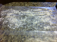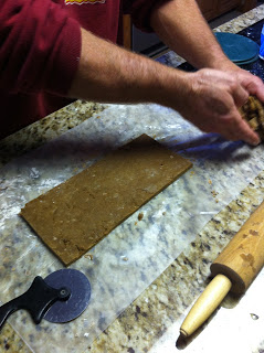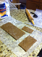 Roll dough flat, use pizza cutter to make even, take excess dough roll out flat again and continue until you have smooth sections to cut your sticks in as shown below.