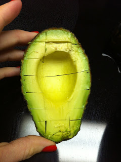 While eggs are cooking, cube avocado like shown below…