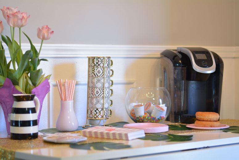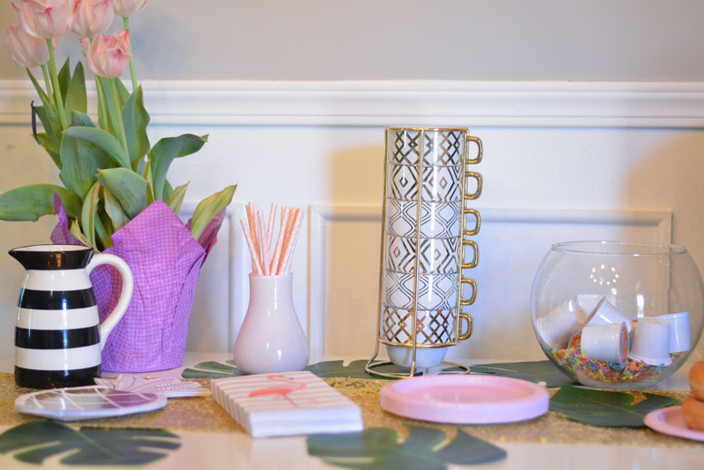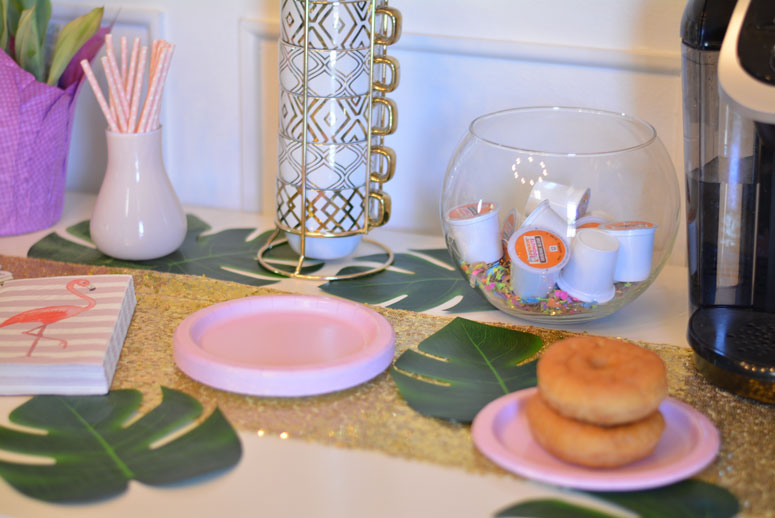 - Starting with the decor think, over the top spring and summer vibes. When I normally thnk of coffee bars I think holidays, fall and cold weather vibes. I don’t know about you guys but I need my coffee year round. Not just in cold months – so when having company over I didn’t see a reason we couldn’t still have a coffee bar. I chose all things pineapple and flamingo for my decor. Mostly, just because I am obsessed with all things flamingo and pineapple right now but, keeping the decor bright and colorful keep the spring vibe feel.