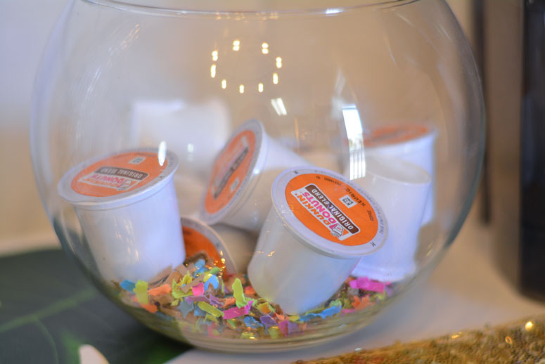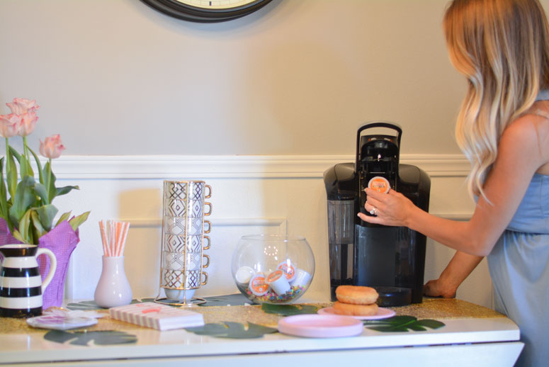 When prepping for our guest to come over I was trying to come up with a way to have a self serve station for the guest to help themselves to a few treats and beverages while I finished up with brunch. I didn’t want them to feel like they were waiting on just me to finish up and you know how everyone always offers to help the host in any way they can. By having a self serve station, your guest do not feel helpless or in the way while waiting on the main event to happen (aka, the meal!) When at Publix grabbing things for our brunch I picked up Dunkin’ Donuts® k-cups (if you do not have a keurig they also have ground coffee and in lots of great flavors) and doughnuts from the bakery along with all of the other food we were having! Tomato, mozzarella and basil paninis anyone?