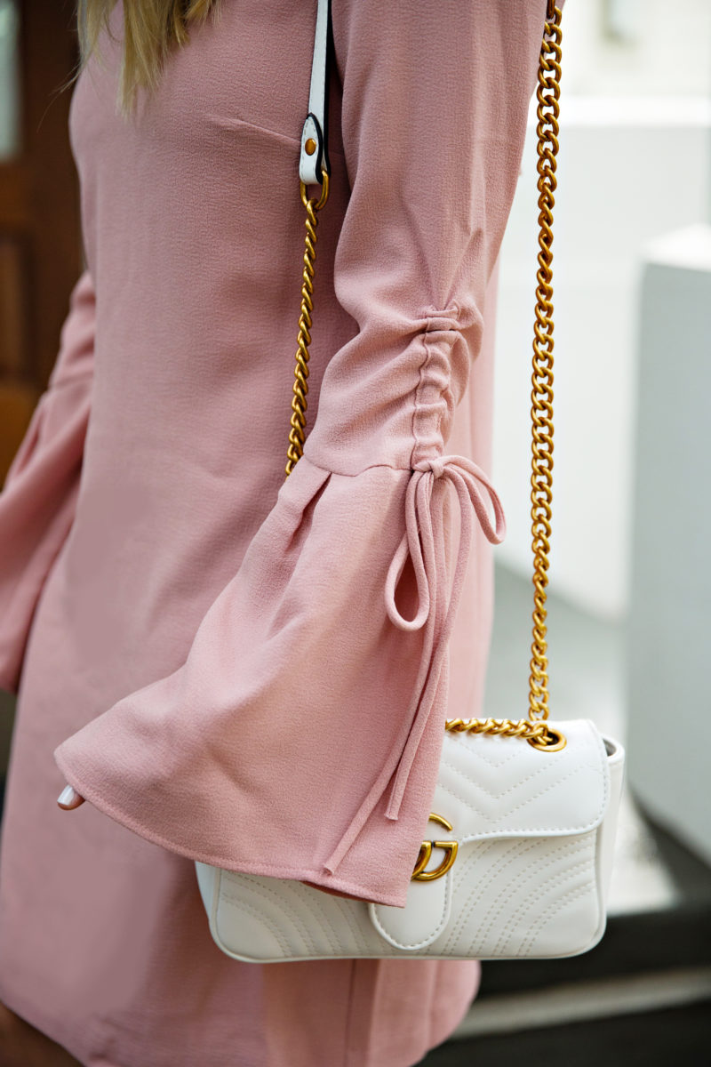 This year, I have curated 6 different Valentines Day outfit options for you guys, making sure everyone can find something they love. I picked outfits that are ranging in all prices as well as modest to a little bit sexy. So, on to outfit one. Whether you are spending it with your husband, boyfriend or girlfriends – we always want to feel pretty and sometimes even “pretty in pink” on this day of love. This pretty little tie bell sleeve dress is sweet, feminine and modest. You could also pair it with a taller pair of heels to show off your legs a bit more. Also, remember I am only 5’2″ so if your taller this dress will hit higher creating a bit of an edgier look, showing off those pretty legs of yours! I have this same pair of heels in two colors because they are honestly the MOST comfortable heels you will ever put on your feet! Plus, I can even chase the kiddos in these!