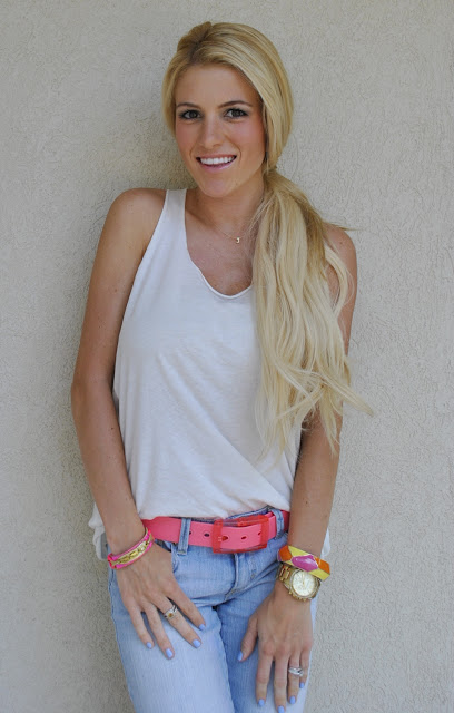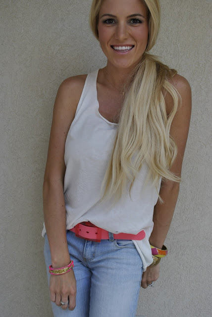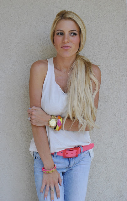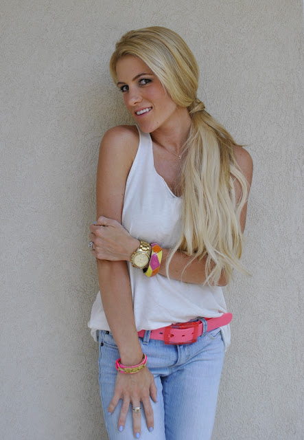 I am loving the super casual belt. Because although it is so casual, it is so neon..and BRIGHT! It’s amazing too, because it comes in a large size and you can cut it to any size you want to fit you! I kind of wish I was a little more crafty so I could think of something to make with the left over neon pink rubber. I just can’t bare to toss it!!! I paired it with this super cute, hand made, zipper bracelet from Ivory Elephant and enamel bracelet City Glam. Such a gorgeous summer day here in Destin! Hope everyone is having great weather as well!!!!