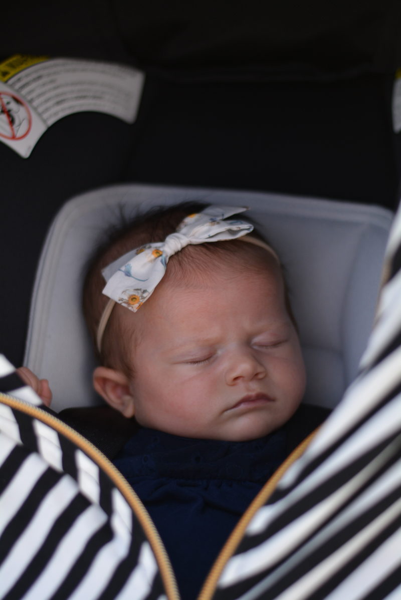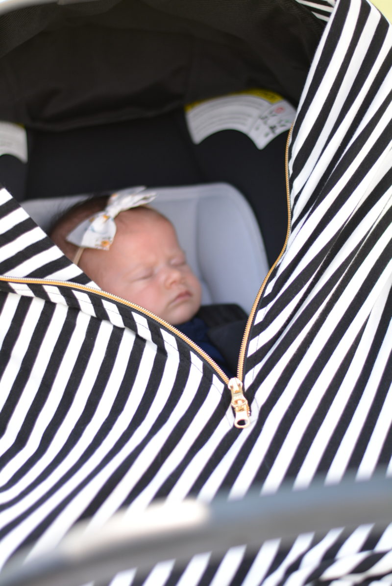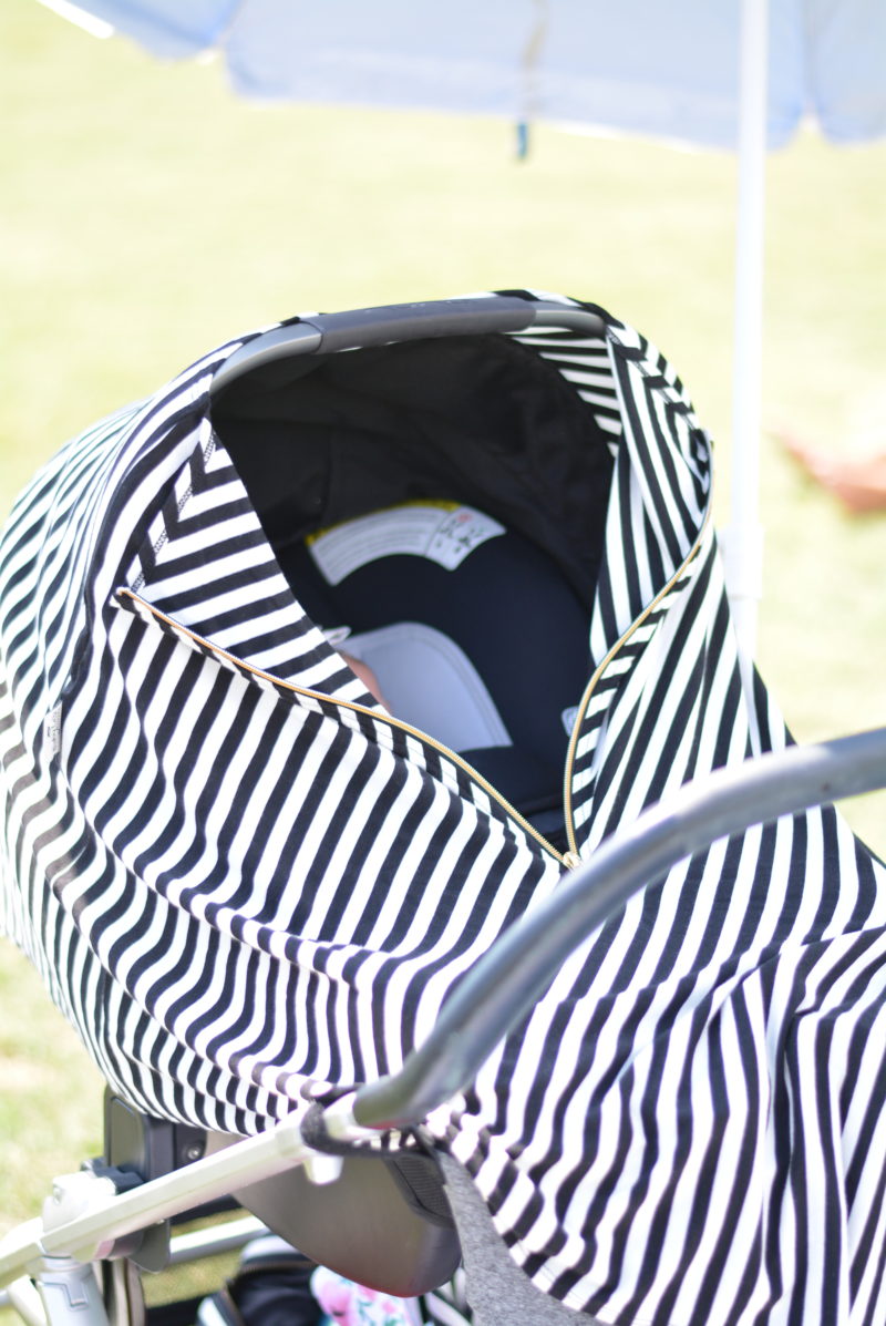 So, even though it is September, ya’ll it is HOT! like so hot! I think it was about 90 degrees that day. What do we do to keep cool? Well, for one – in the grass we propped up our beach umbrella to give us all some shade! Ha! We stayed hydrated and ended up with our shoes off after about 10 minutes to let our feet cool off! I also brought this carseat cover by Baby Leaf and I am so thankful I did. It is thin and is easily unzipped for me to get to her when needed as well as to let some air in but keeps her in the shade at all times! The zipper doesn’t get hot because its actually nylon coil vs. metal and the cover can actually be used 6 different ways! It can be used as an infant car seat cover, baby carrier cover, nursing cover, stroller cover, swing cover, shopping cart cover, poncho and scarf.