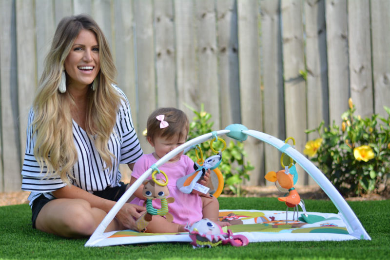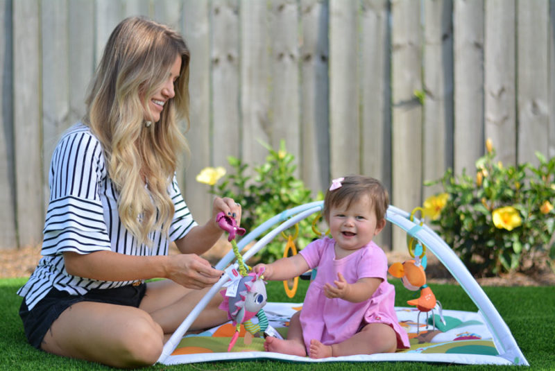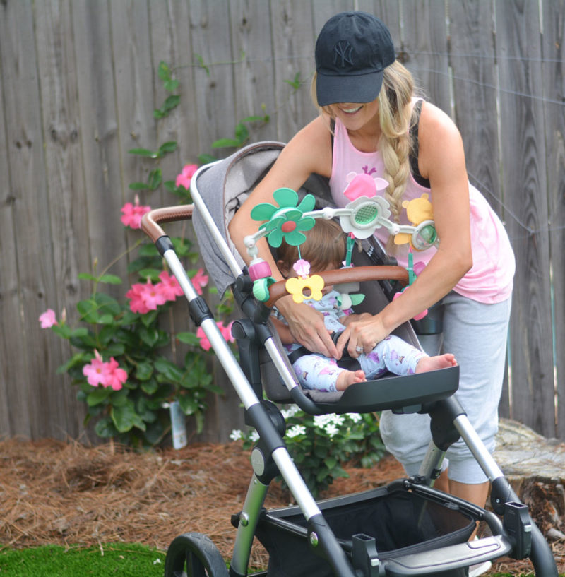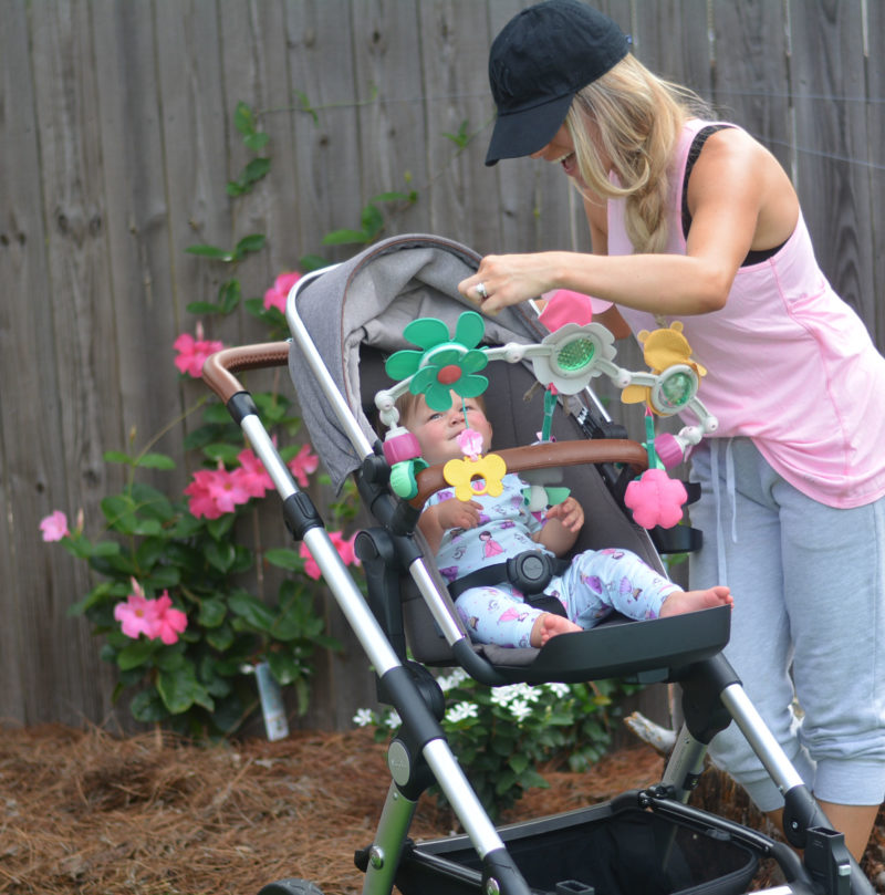 The play mats from each collection are uniquely versatile with adjustable moving arches that adapt to baby’s age and stage, encouraging the development of fine and gross motor skills. Charli loves having snacks and playing on her mat in the backyard, while I am working or at Braydon’s Tball games! The Marie Jumpy has also become a favorite that we carry around with us to restaurants and everywhere else we go! It is also great because it has a claw clip and can attach on to pretty much anything, including the highchair!