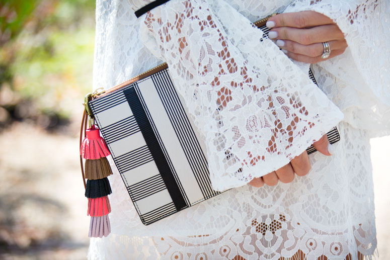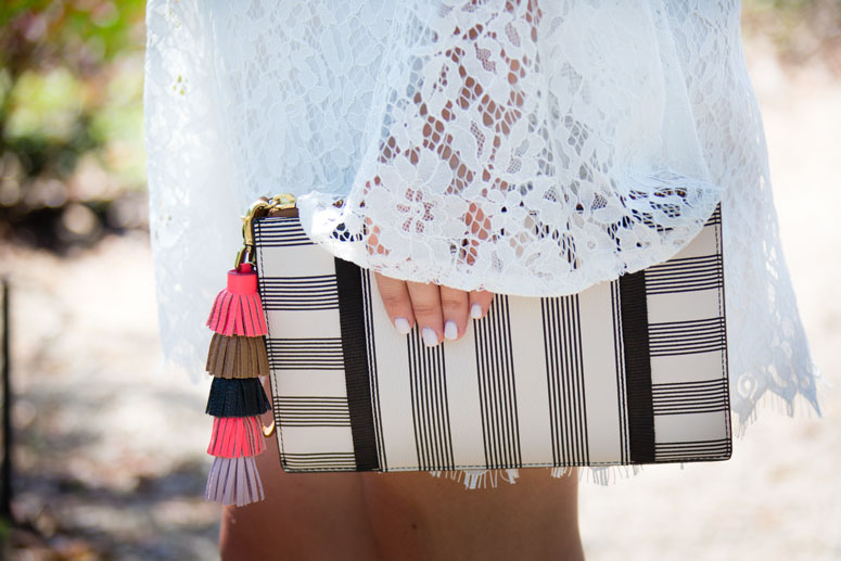 I styled it with my new black and white clutch that I am loving and clipped on my multi-color key chain for just the tiniest pop of color to spice up the entire look! I have worn this keychain on several bags now and I love that I will be able to also use it on my keys when I am over styling it on my bags!